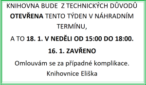 KNIHOVNA BUDE Z TECHNICKÝCH DŮVODŮ OTEVŘENA TENTO TÝDEN V NÁHRADNÍM TERMÍNU, A TO 18. 1. V NEDĚLI OD 15:00 DO 18:00. 16. 1. BUDE ZAVŘENO Omlouvám se za případné komplikace. Knihovnice Eliška
