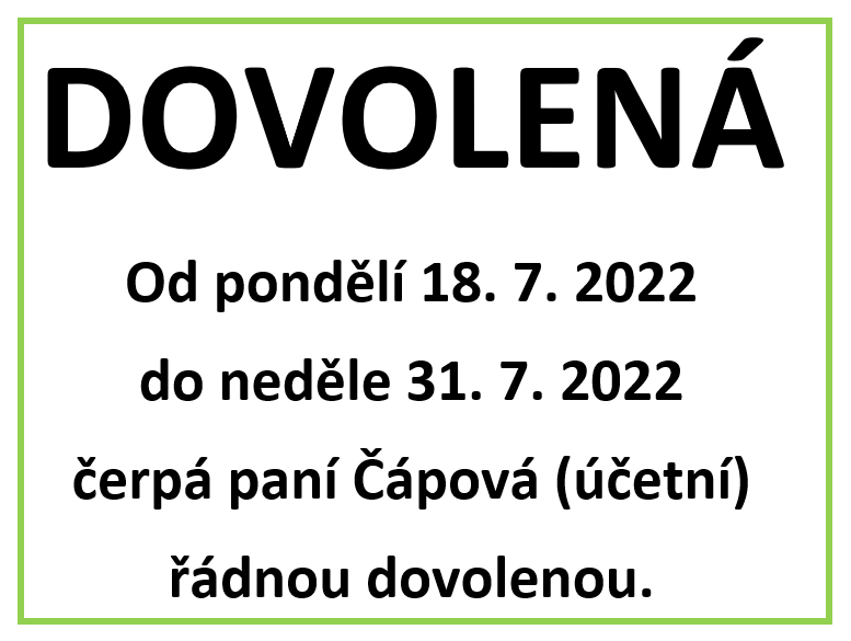 DOVOLENÁ Od pondělí 18. 7. 2022 do neděle 31. 7. 2022 čerpá paní Čápová (účetní) řádnou dovolenou. Děkujeme za pochopení