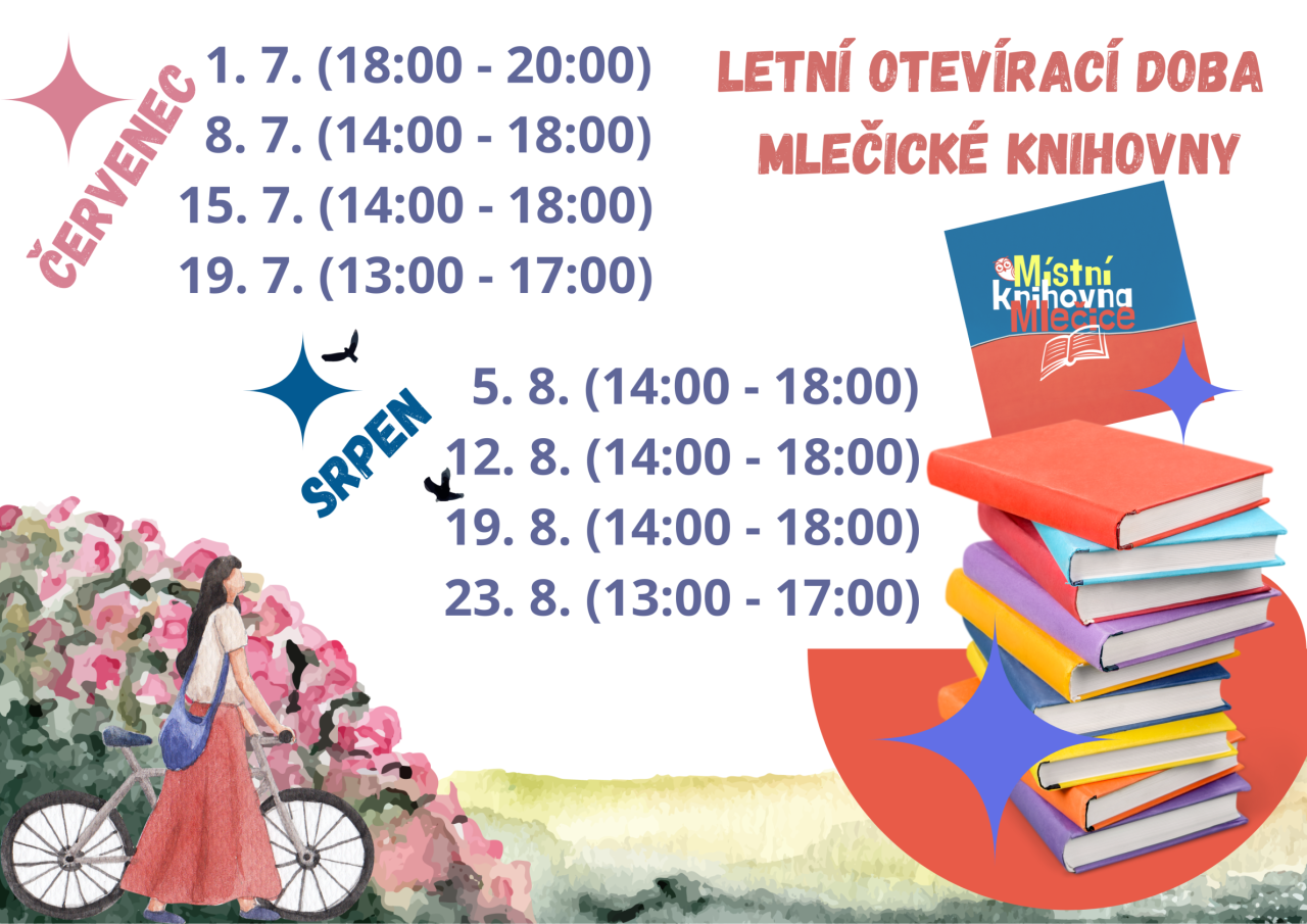 Letní otevírací doba. Knihovna dnes otevřena od 13:00 do 17:00.