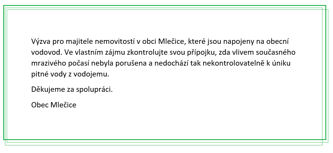 Výzva pro majitele nemovitostí v obci Mlečice, které jsou napojeny na obecní vodovod. Ve vlastním zájmu zkontrolujte svou přípojku, zda vlivem současného mrazivého počasí nebyla porušena a nedochází tak nekontrolovatelně k úniku pitné vody z vodojemu. Děkujeme za spolupráci. Obec Mlečice