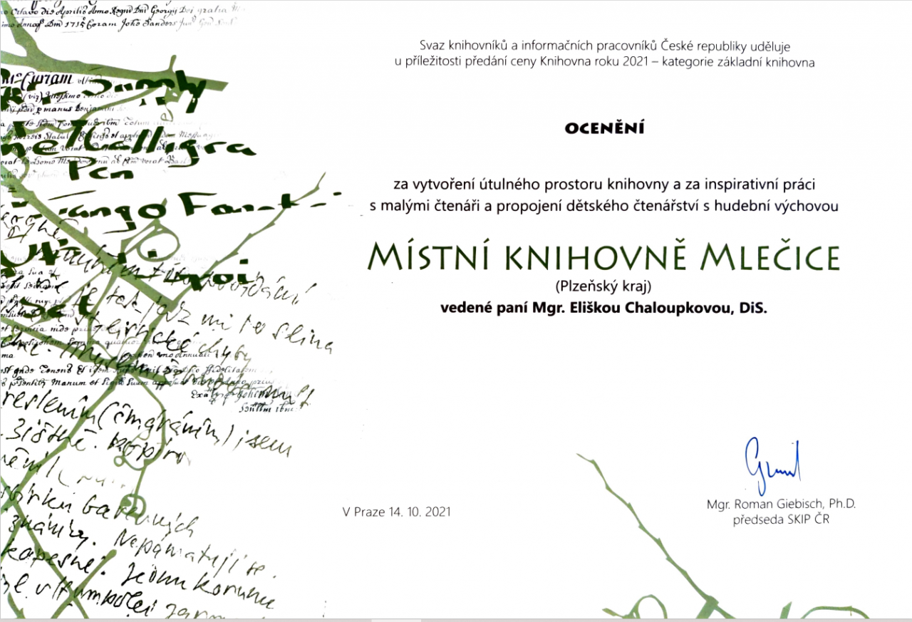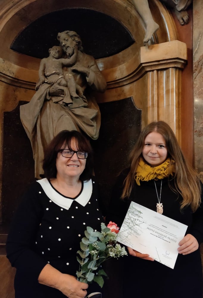 Ocenění za vytvoření útulného prostoru a za inspirativní práci s malými čtenáři (propojování čtení s hudební výchovou ) převzala z rukou ministra kultury pana PhDr. Lubomíra Zaorálka a Mgr. Romana Giebische, Ph.D. - předsedy Svazu knihovníků a informačních pracovníků knihovnice a paní starostka.