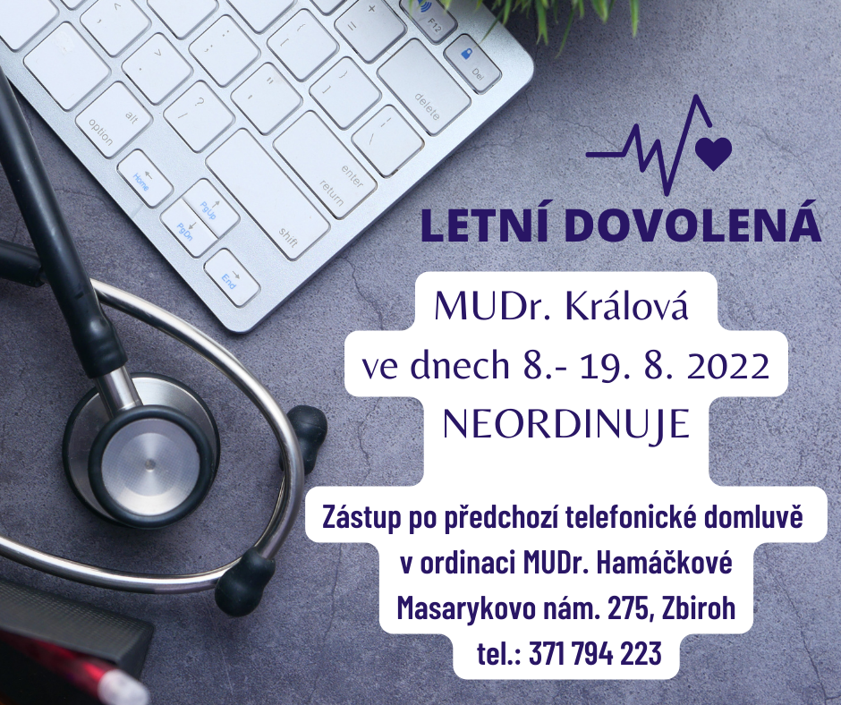 Zástup po předchozí telefonické domluvě v ordinaci MUDr. Hamáčkové - Masarykovo nám. 275, Zbiroh