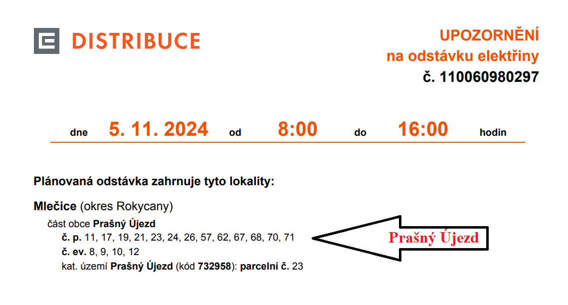 5. 11. bude probíhat plánovaná odstávka elektřiny od 8:00 do 16:00 v obci Prašný Újezd (viz. přiložený obrázek).
