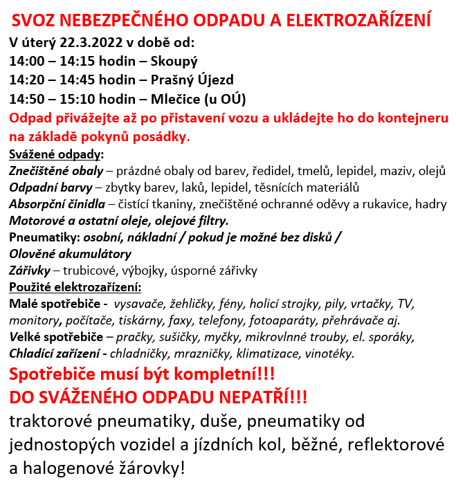 V úterý 22. 3. 2022 proběhne svoz nebezpečného odpadu. Pokyny jsou přiloženy v obrázkové příloze.
