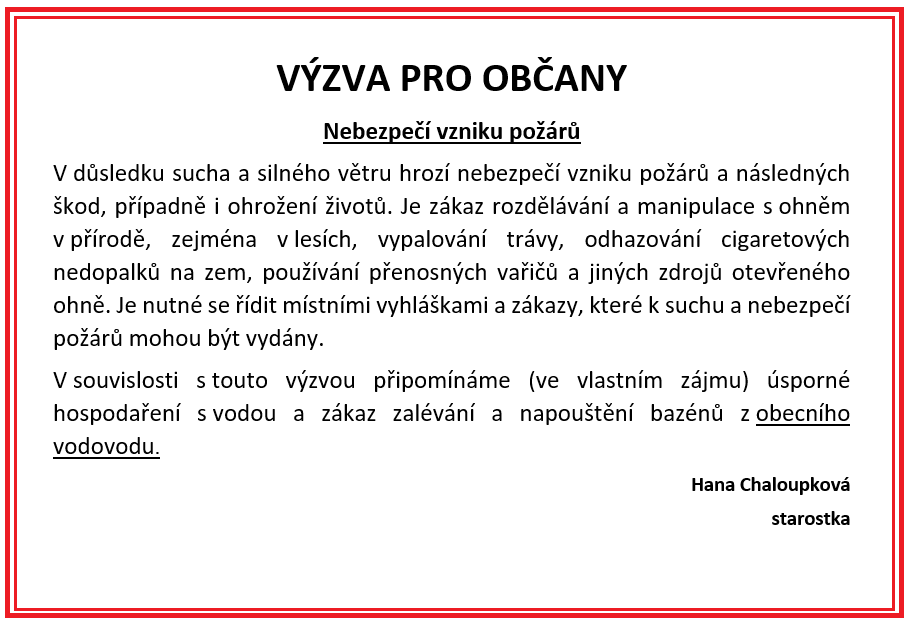 V důsledku sucha a silného větru hrozí nebezpečí vzniku požárů a následných škod, případně i ohrožení životů. Více informací na přiloženém letáčku. Děkujeme za pochopení