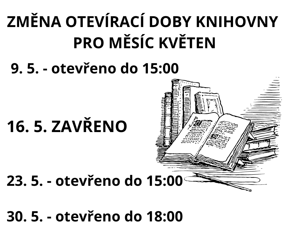 Z technických důvodu se na měsíc květen mění otevírací doba knihovny. Kroužek pro děti proběhne výjimečně v sudé pondělí 30. 5. v normální časy (mladší skupinka 16:00, starší skupinka 15:00). Kroužky netradičně proběhnou i v měsíci červnu.